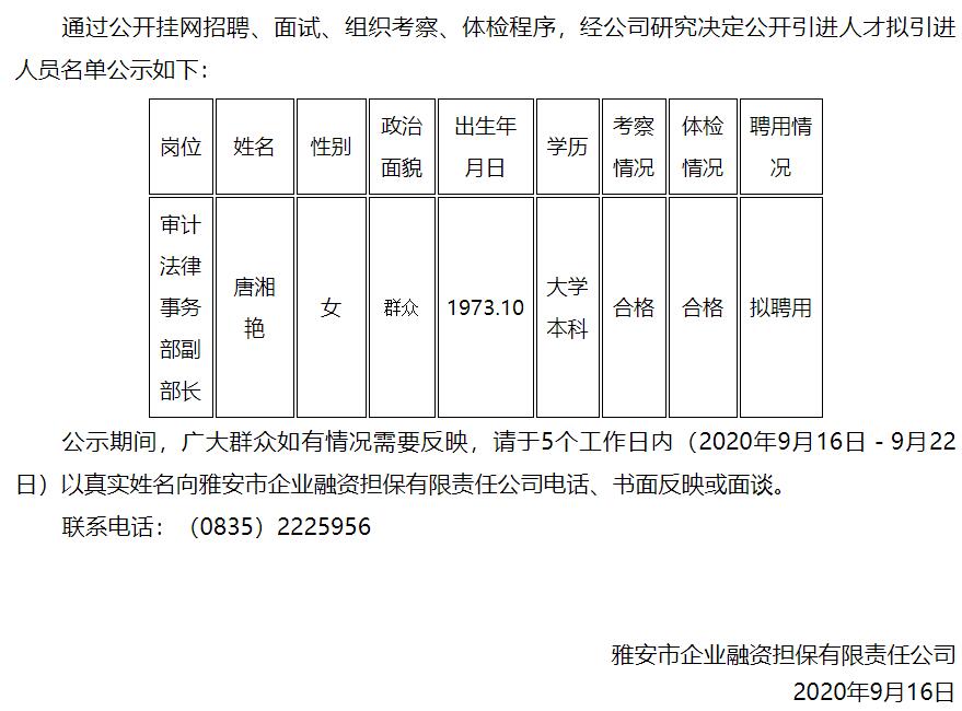 雅安市企業(yè)融資擔保有限責任公司公開引進人才擬引進人員名單公示
